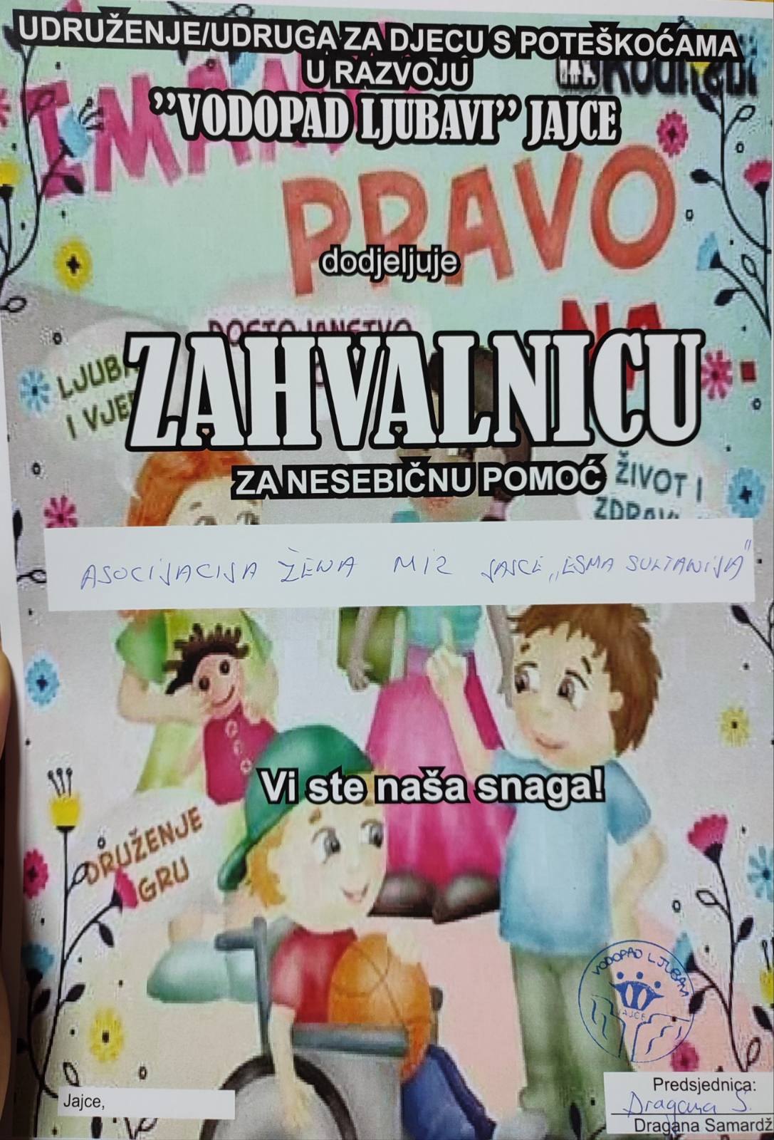 “Vodopad ljubavi” – Udruženje/udruga za djecu sa poteškoćama u razvoju Jajce okuplja 24 djece sa manjim ili težim oblicima poteškoća u razvoju i njihove roditelje koji na međusobnim druženjima razmjenjuju iskustva, pružaju potporu jedni drugima i svojoj djeci osiguravaju stručnu potporu u razvoju i obrazovanju.